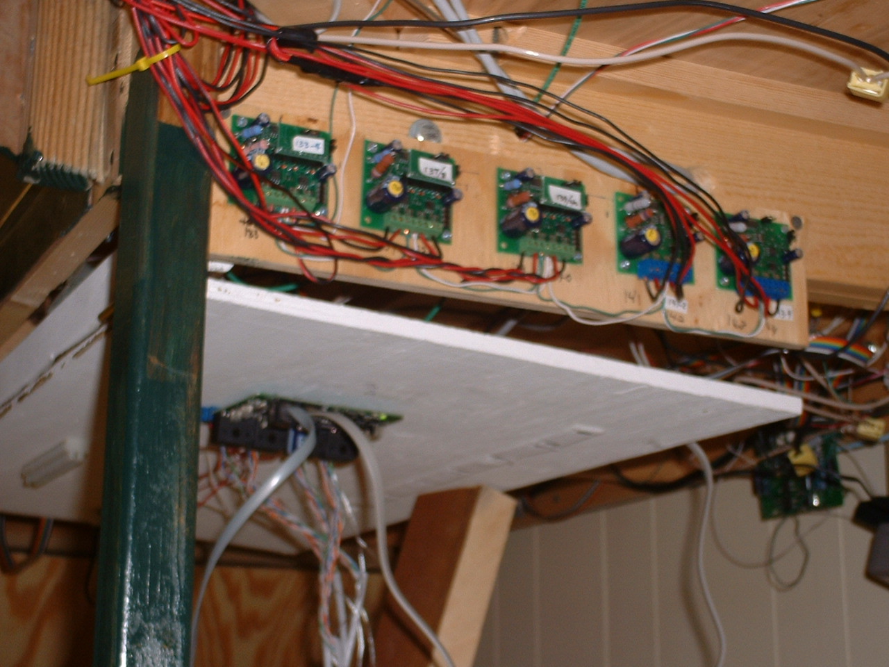 The circuit board on the white plywood is another BDL168 under construction. The circuit board near the back wall is a Tonys Train Exchange Autoreverser for the crossing above.