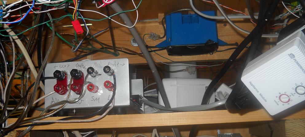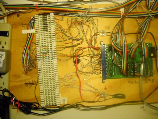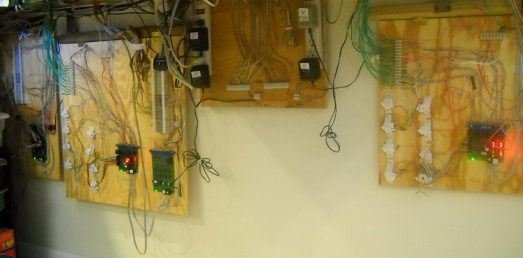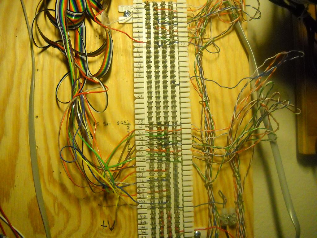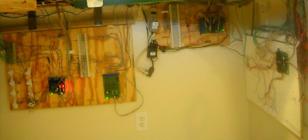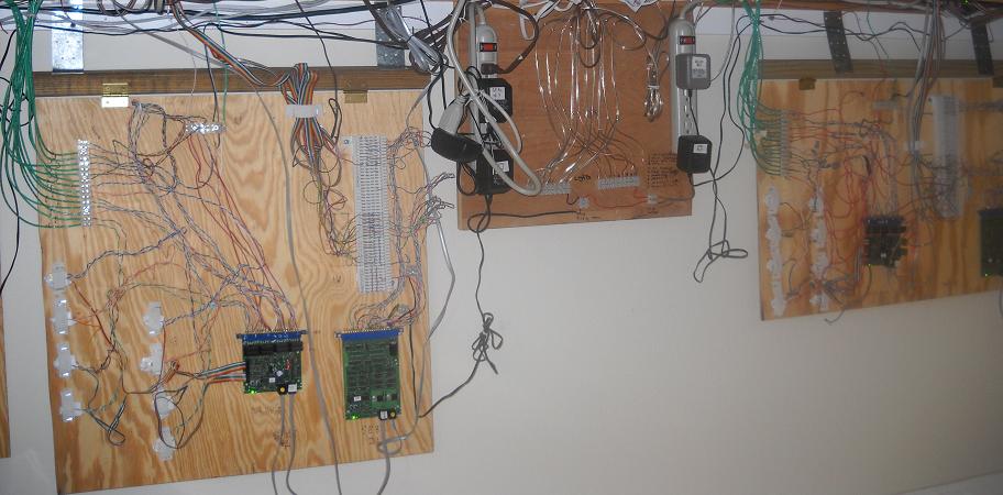 Se8C ID #5 is driving 8 Turnout Tortoises (left top), 8 occupancy sensors (left, center) and 32 signal heads (right, multi-color cables).