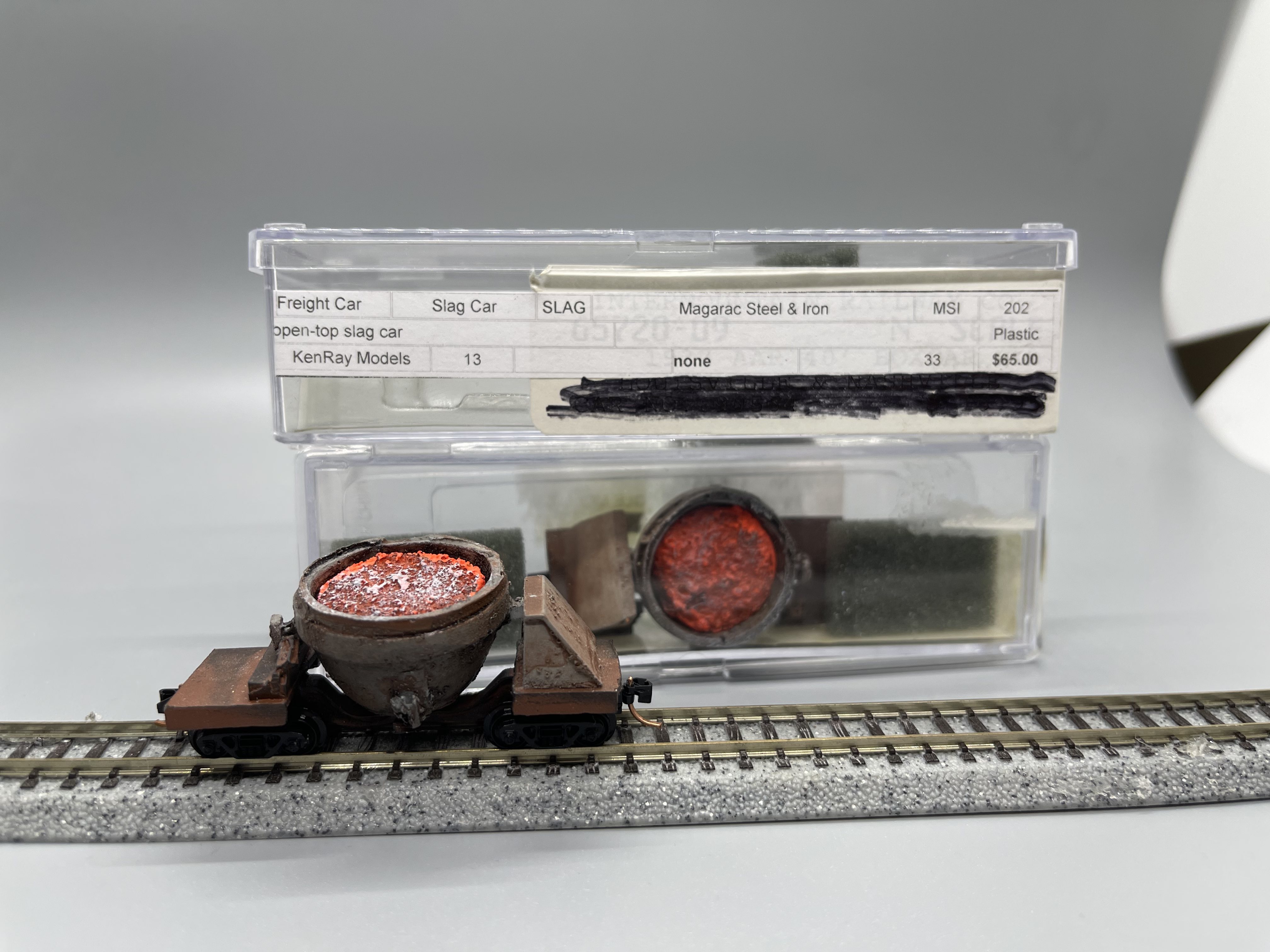 Two KenRay model N SCALE MACARAC Steel & Iron open-top Slag Cars. Came without trucks. Added MicroTrain Trucks to each car. Otherwise new. Never run in Operations. Only test run after Microtrain couplers and trucks were added. Bought around 2007 as part of a future plan to build a Steel Mill which never happened.