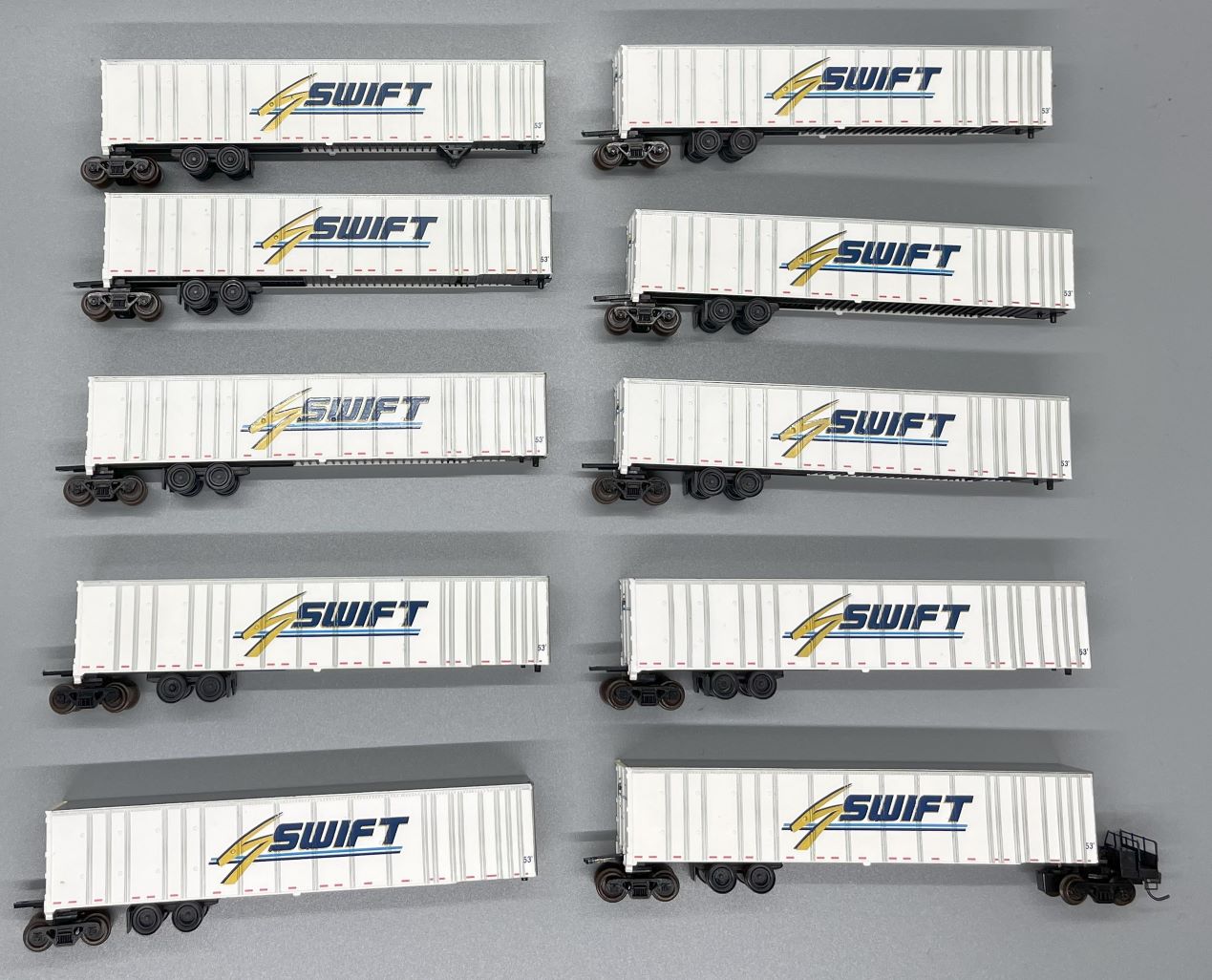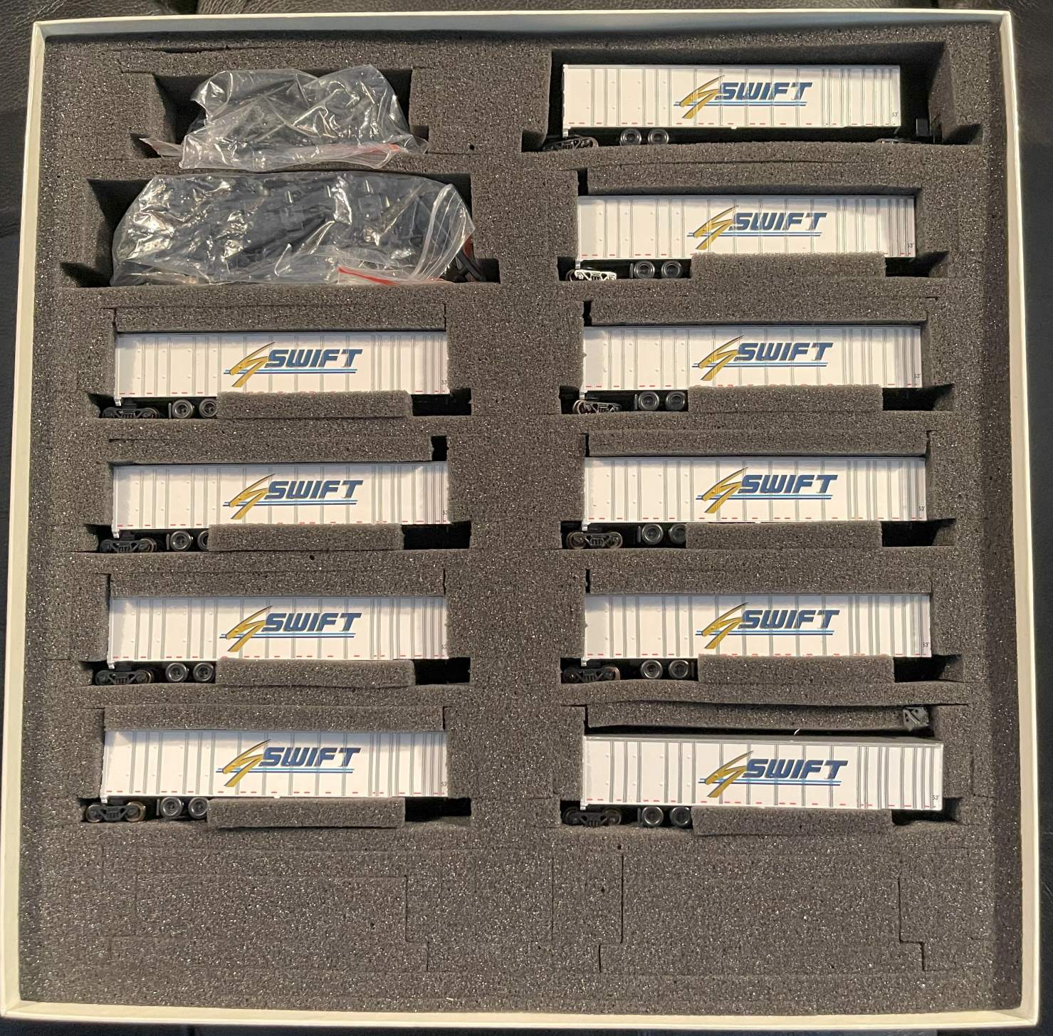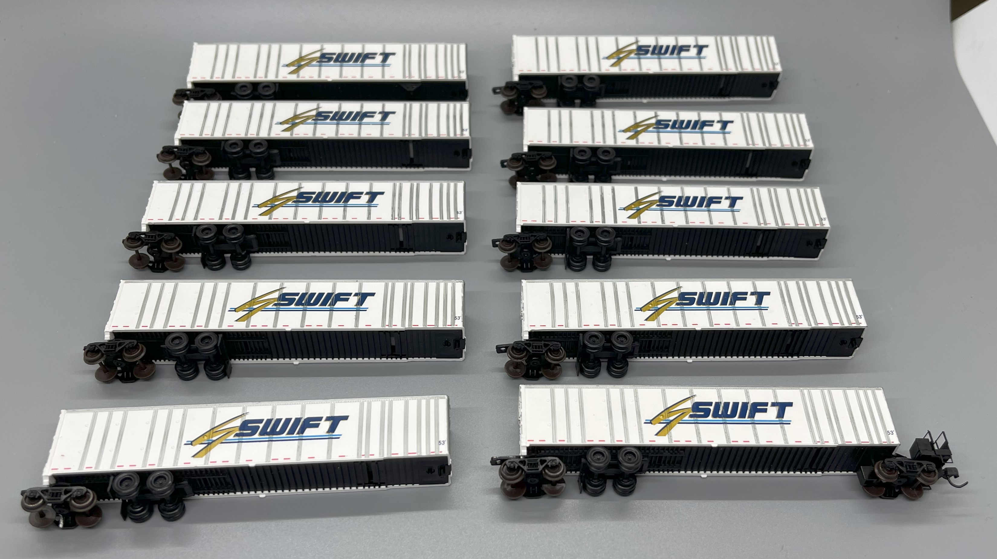 Click this video link to see these cars pulled by a loco on my layout: Swift Roadrailer 10 car. mp4