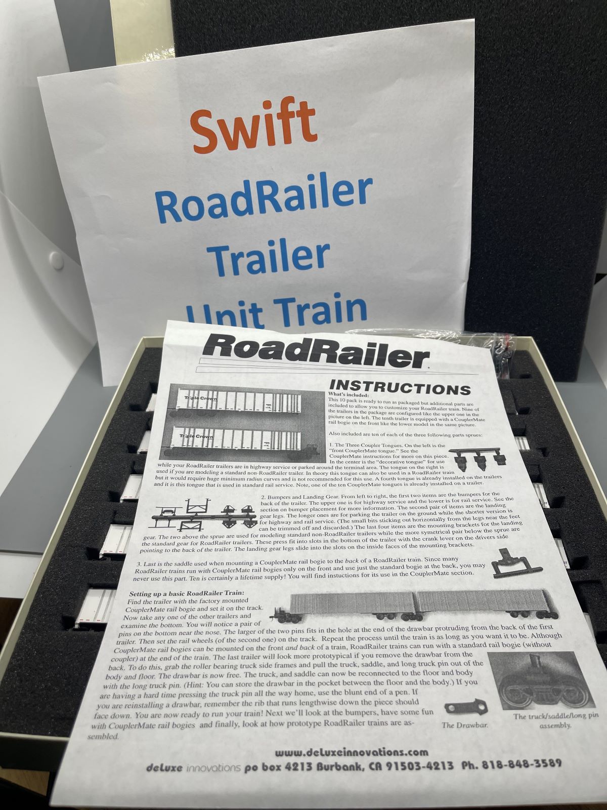 This item includes 10 Roadrailer cars which has been run very infrequently since purchased new. All 10 run effortlessly as seen in a video below that was prepared for this sale item. An extra and rare Deluxe Innovations Roadrailer coupler mate rail bogie is included free. Many plastic part options for the trailers are included. Asking price for this item is $370.